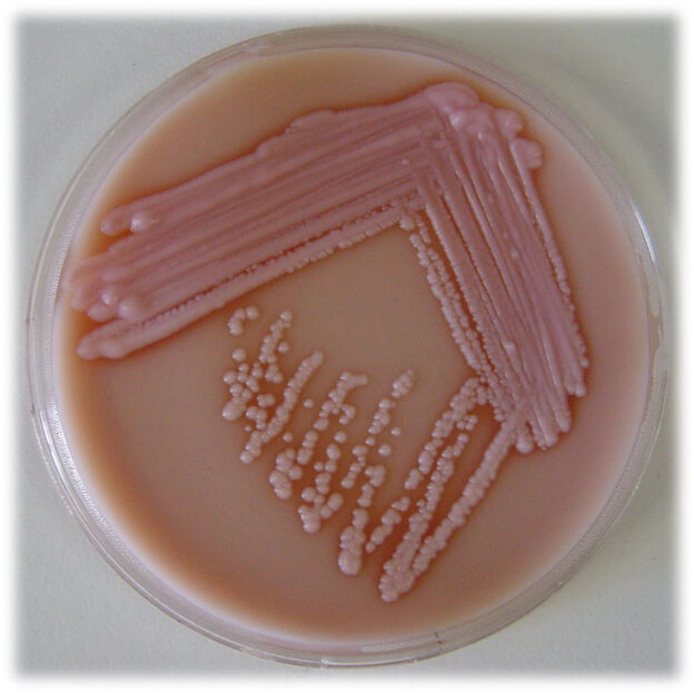 Dar como confirmativas las colonias rosas, rodeadas de un halo transparente y rojo (por redisolución del carbonato) que se ve mejor sin membrana y con olor a vinagre, ratón, establo o cuero.