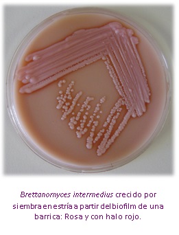 - Dekkera bruxellensis desde CBS 74T, Excelente, colonias de color rosado con halos casi transparentes alrededor y olor a vinagre o a ratón característico.