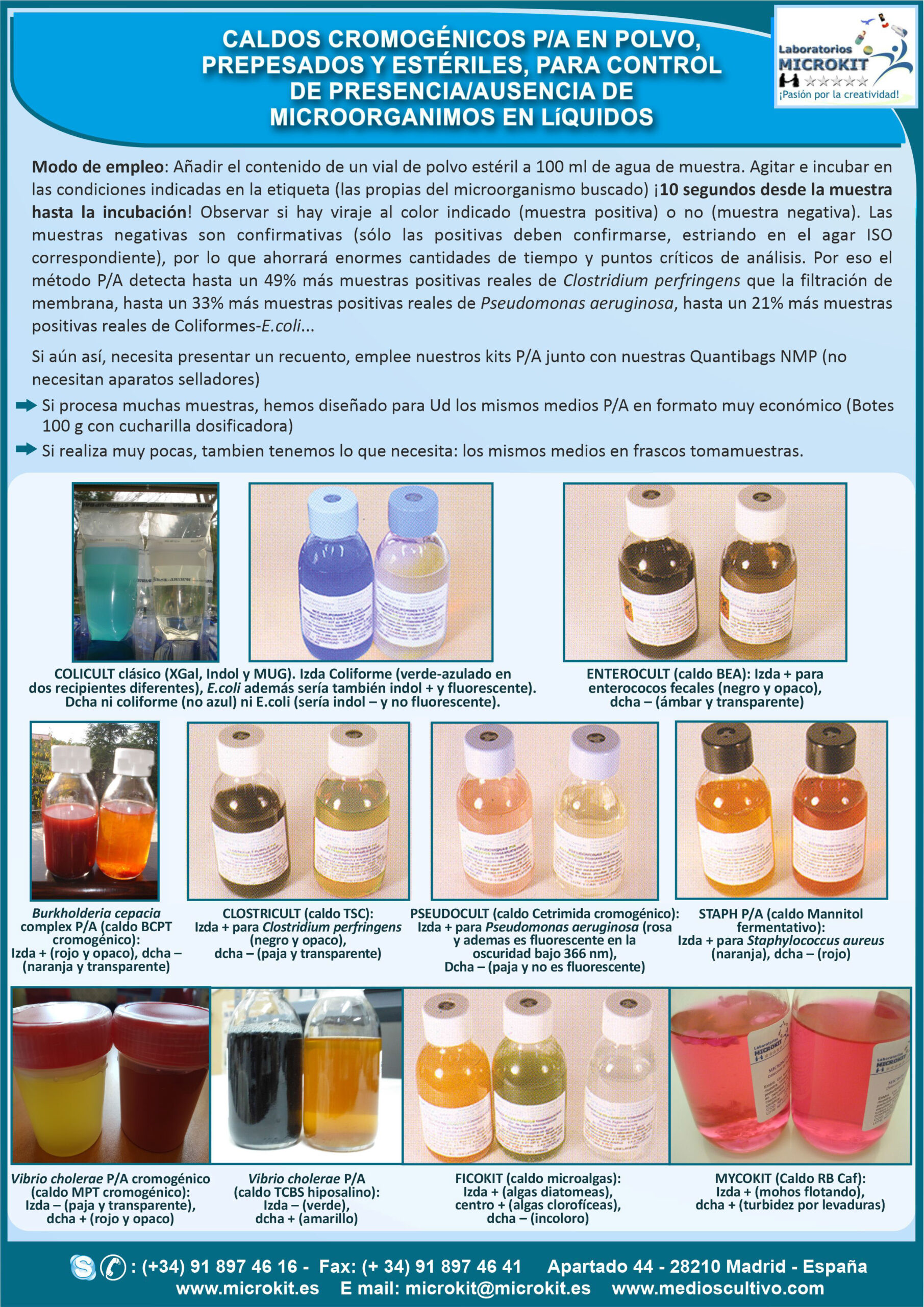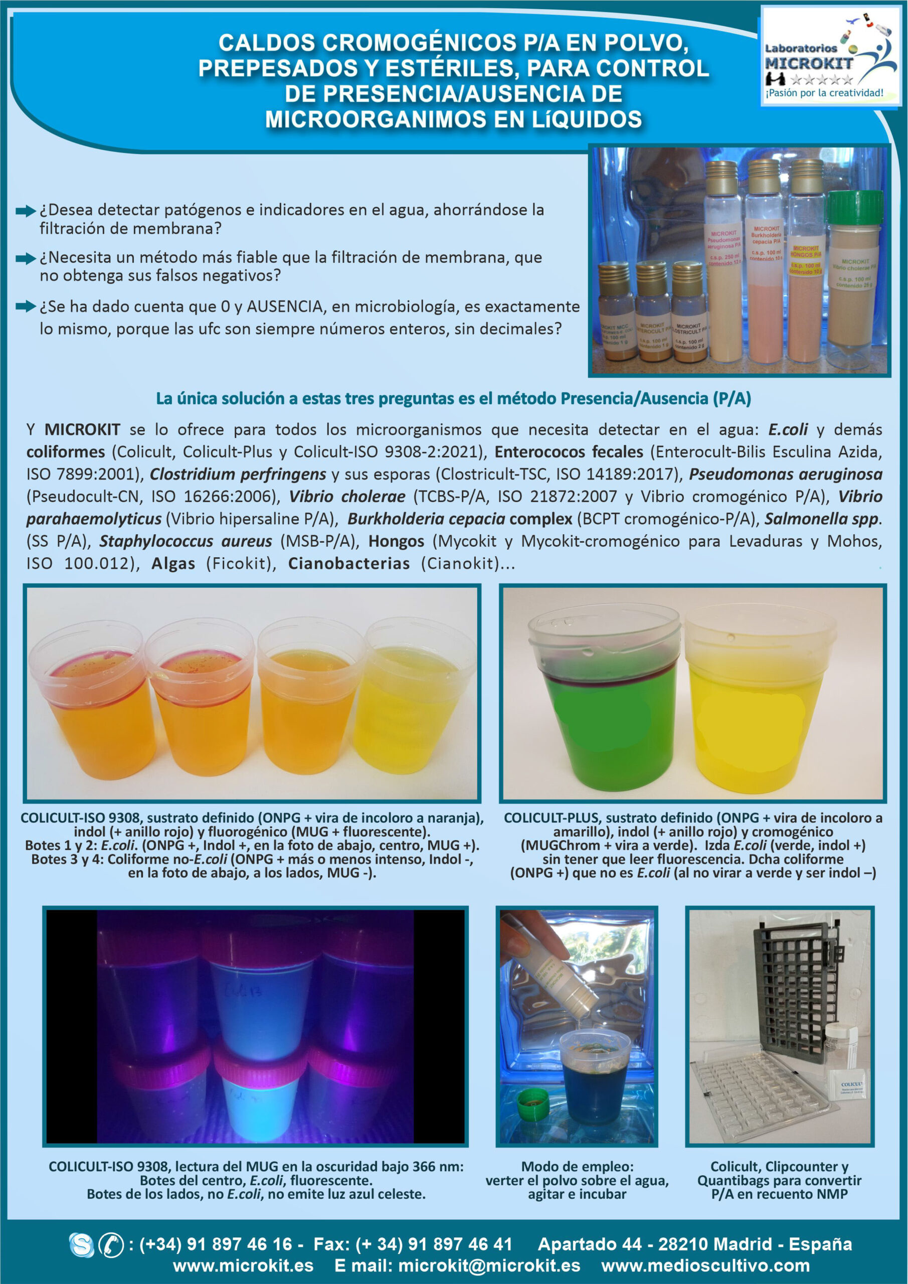 Pseudomonas aeruginosa,Burkholderia cepacia,Hongos, Vibrio cholerae y Staphylococcus aureus, pueden ser desde ahora controlados como ya lo eran E.coli + Coliformes, Enterococos y Clostridium perfringens, con los kits en polvo estéril contenido en viales o tubos (cuando la cantidad de polvo necesario por test es grande).