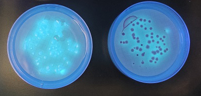 ,,,y al mismo tiempo de ver la prueba de la Acetamida, podremos observar si aparece halo fluorescente alrededor de las colonias rojas, señal de que se trata de Pseudomonas aeruginosa.
