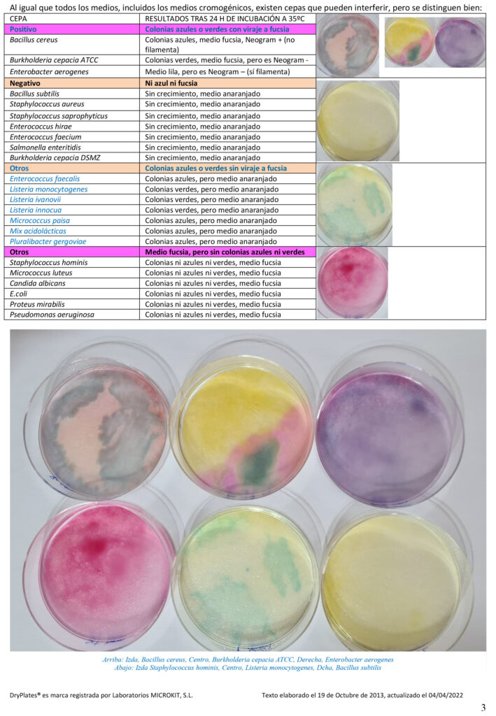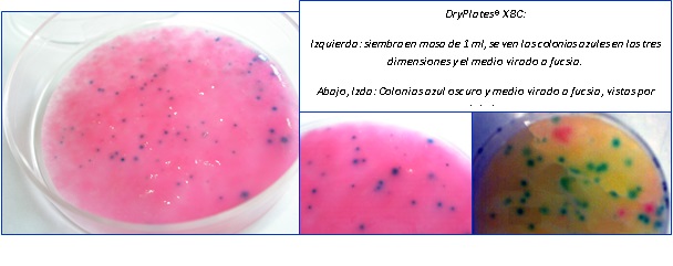 es el medio oficial según Normas ISO 7932 e ISO 21871 para la detección y recuento de Bacillus cereus en alimentos. El cromógeno añadido por MICROKIT es específico para B.cereus, lo que evita los falsos positivos de otros Bacillus spp. típicos del Agar Mossel, que en DryPlates ®XBC crecen con colonias de otros colores y/o sin viraje del medio salmón a fucsia. La aparición de colonias azules y/o el viraje del medio salmón a fucsia permite la detección precoz y confirmativa de B.cereus: en cepas potentes incluso desde las primeras 6 horas de incubación y en cepas más estresadas en las primeras 18-24 h de incubación.