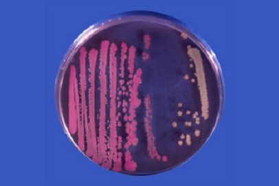 Las otras cepas de E. coli crecen con colonias púrpuras (estría izquierda de la foto).