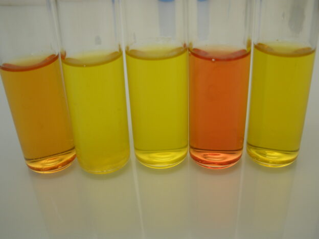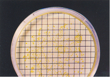 Colonias amarillas de Staphylococcus aureus, en cartón absorbente, con medio virado del rojo al amarillo.