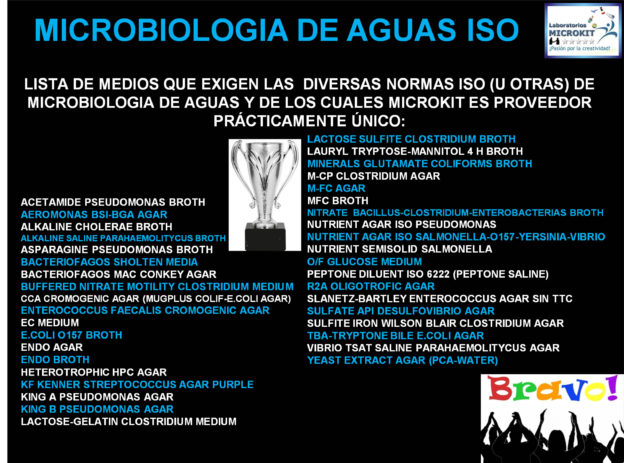Muchos de los medios (sobre todo de confirmación) que aparecen en Normas ISO y otras normativas son difíciles de encontrar y los laboratorios que desconocen esta particularidad de MICROKIT, se los han de formular a partir de sus componentes o emplear suplementos de difícil esterilización. Es el caso de: Bacteriófagos (colífagos) Scholten media, Acetamida Broth, Buffered Nitrate Motility Medium, Lactose-Gelatin Medium, Heterotrophic HPC Agar, Alkaline y Alkaline-Saline Broth, Endo Agar y Broth, Enterococcus EPA Agar, Vibrio TSAT Agar, Sulfate API Agar …