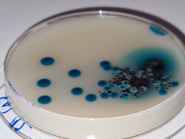 Salmonella puede diferenciarse de otras Enterobacterias gracias a su mecanismo para producir alfa-galactosidasa en ausencia de beta-galactosidasa. MICROKIT® CROMOSALM incorpora dos sustratos cromogénicos, CHE-Gal y X-alfa-gal, que permiten visualizar esta actividad en la misma placa. Efectivamente, CHE-Gal es metabolizado por la beta-galactosidasa, produciendo colonias negras en presencia de hierro, como ocurre en la mayoría de Enterobacterias. X-alfa-gal es hidrolizado por Salmonella produciendo colonias verde-azuladas, claramente distinguibles de las de otras Enterobacterias, negras y de las de otros microorganismos, incoloras. Las reacciones cromogénicas están muy concentradas en las colonias, dejando al medio de su color natural, crema. El resto del medio está basado en la fórmula DCA de Hynes, utilizando desoxicolato sódico y citrato sódico como inhibidores de la flora acompañante. Gracias a todo ello, MICROKIT® CROMOSALM detecta las cepas enterotoxigénicas de Salmonella (S.enteritidis, S.typhimurium, S.paratyphi…) y también detecta S.typhi, en todo tipo de muestras alimentarias, clínicas, agua…