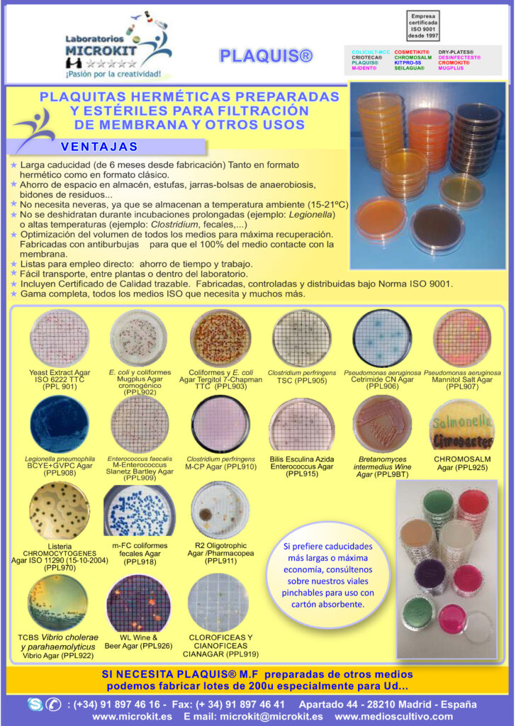 ® PLAQUITAS PREPARADAS HERMETICAS MICROKIT® de 55 mm para filtración de membrana y también muy útiles para aislamientos por siembra en estría. Su hermeticidad les proporciona hasta 6 meses de caducidad real y minimiza la contaminación por golpes en el transporte. Disponibles todos los medios de cultivo de filtración de membrana y otros muchos para siembra por estría tras enriquecimiento.