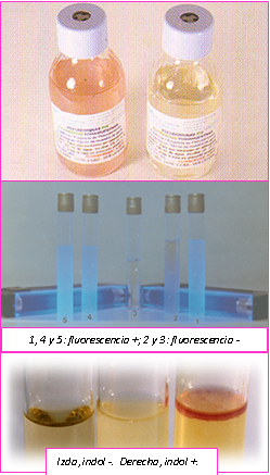 - Pseudomonas aeruginosa WDCM 00026, vira a rosa, da fluorescencia azul en la oscuridad bajo 366 nm y no genera anillo rosa de indol, en las primeras 24h si el inóculo es alto y no procede de muestras estresadas, en 48-72h en caso contrario.