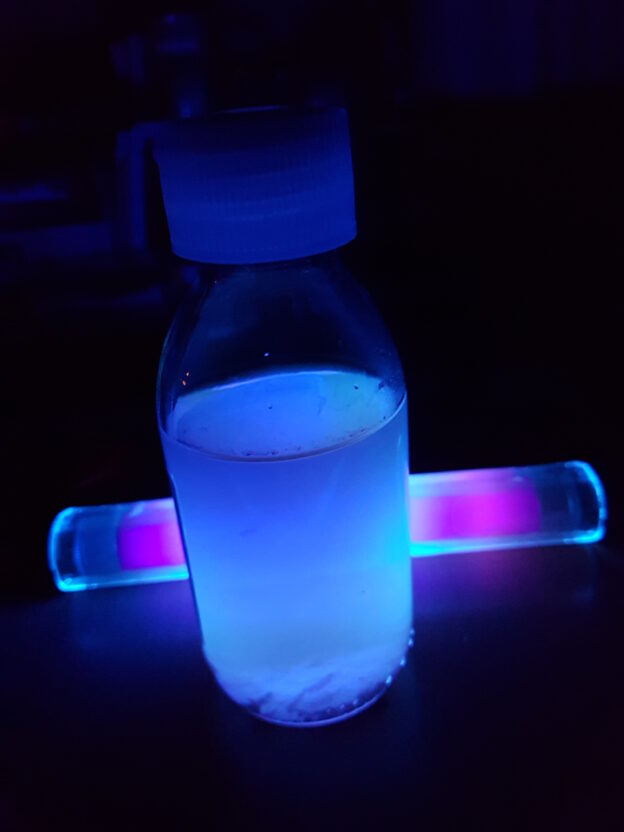 El viraje a color rosa-rojo demuestra la Presencia de P.aeruginosa en la muestra de agua. La Fluorescencia azul que se observa en la oscuridad bajo U.V.A. de 366 nm (linterna VMT050) confirma que se trata de P.aeruginosa (además con 0,5 ml de KOVACS-SBH056, NO hay anillo rojo de Indol en superficie). Ya que hay otros microorganismos capaces de virar a rosa, pero no son fluorescentes ni indol -.